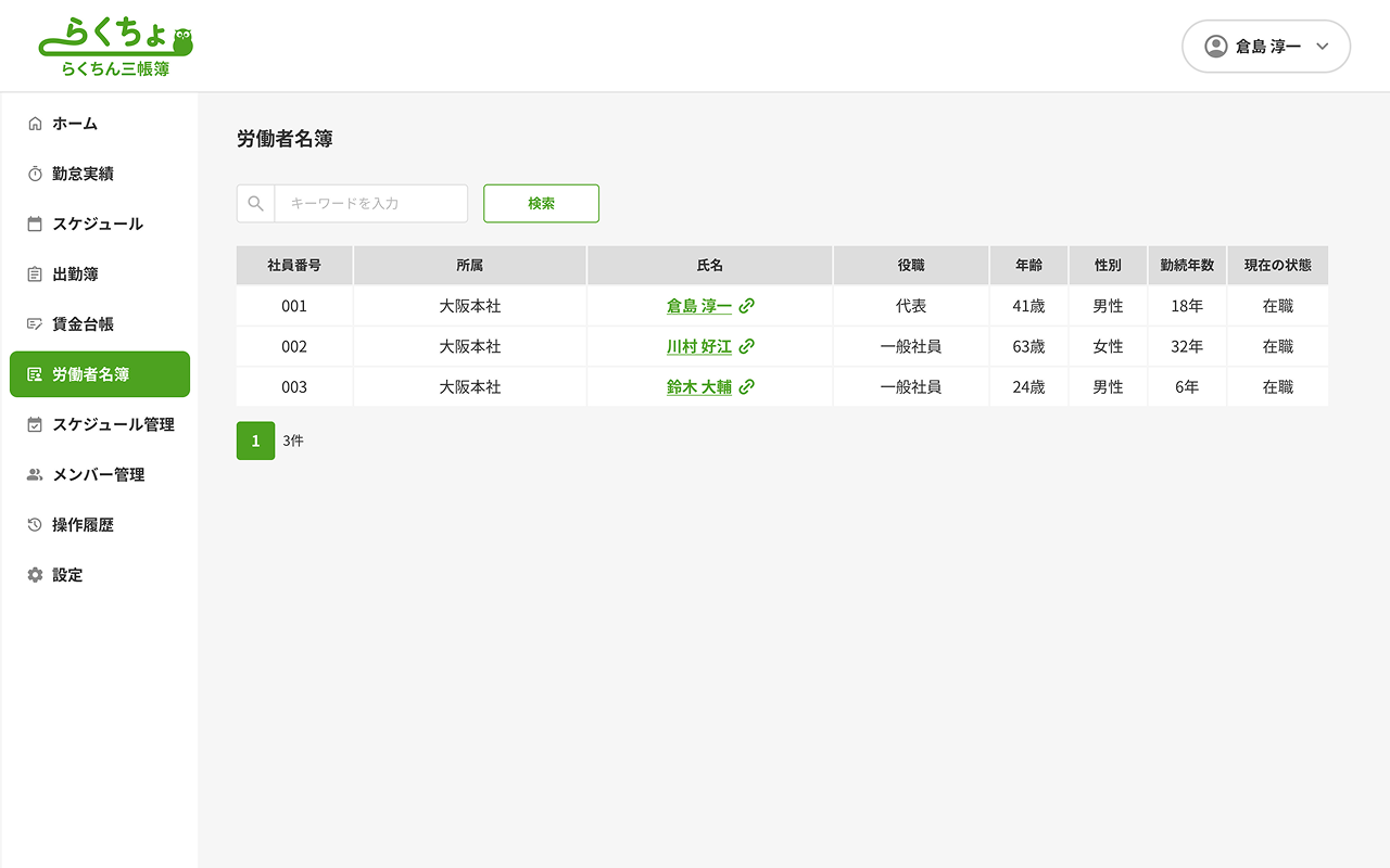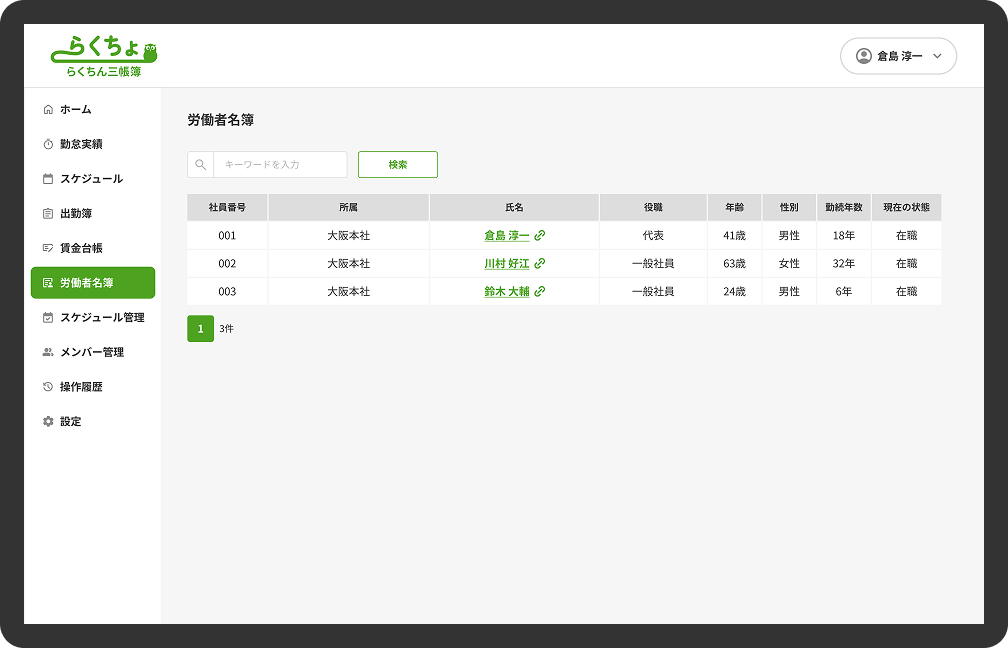 従業員の氏名・所属・勤続年数などを一元管理。帳簿の更新や確認作業をスムーズに行えます。